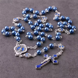 Toptan bakire Mary gümüş çapraz İsa mesih haç tespih kolye uzun bağlantı zinciri mavi inci boncuk hıristiyan ürün